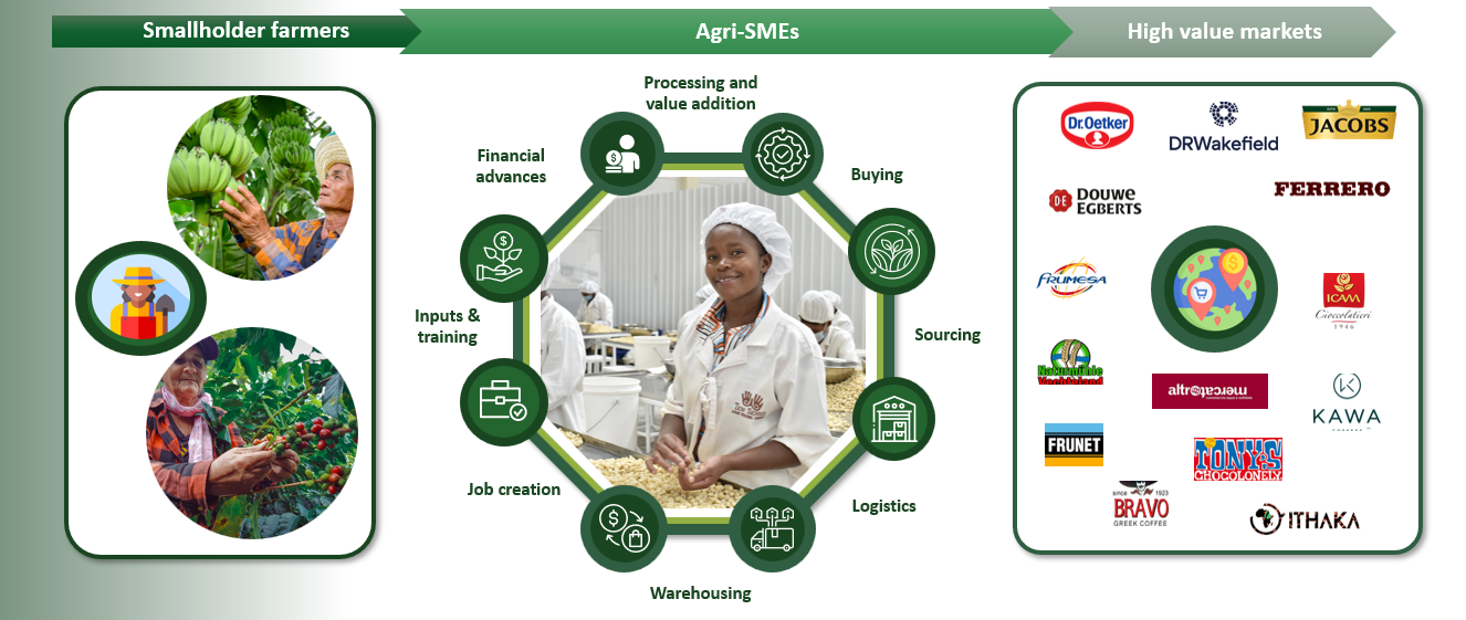 We focus on established agri-SMEs operating at critical points in agricultural value chains—such as aggregation, processing, and export. These businesses play a pivotal role in linking smallholder farmers to markets and enabling value creation.