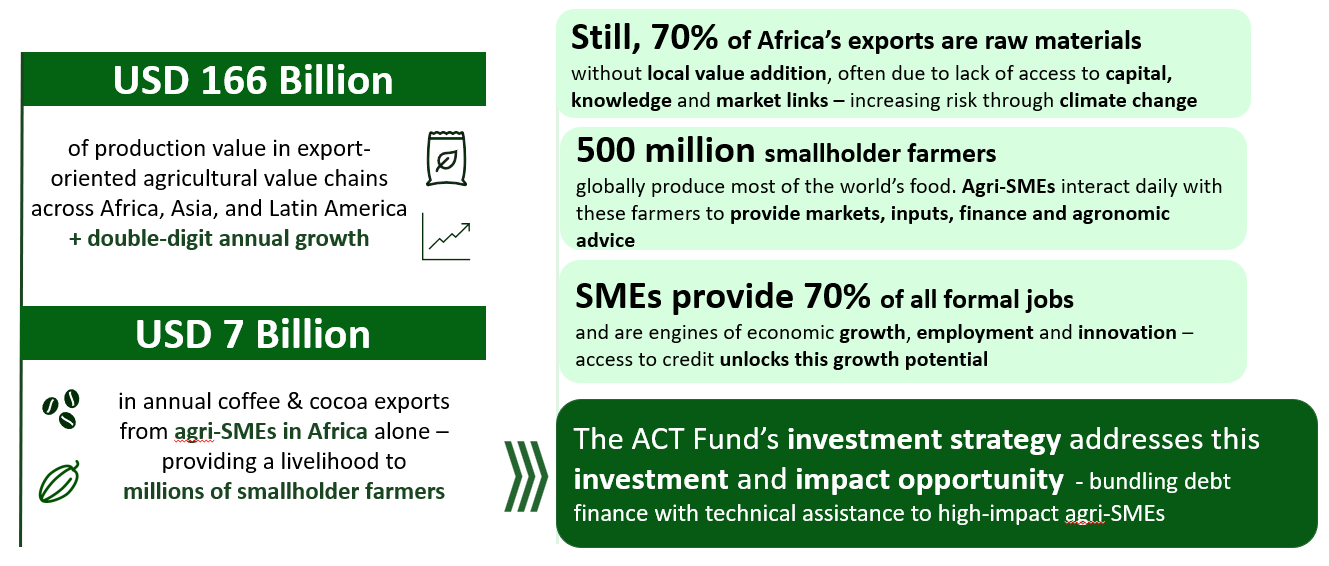 ACT Fund’s strategy is designed to unlock the potential of agricultural value chains by investing in high-impact agri-SMEs that connect smallholder farmers to markets, finance, and sustainable growth.